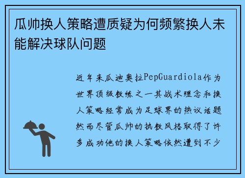 瓜帅换人策略遭质疑为何频繁换人未能解决球队问题